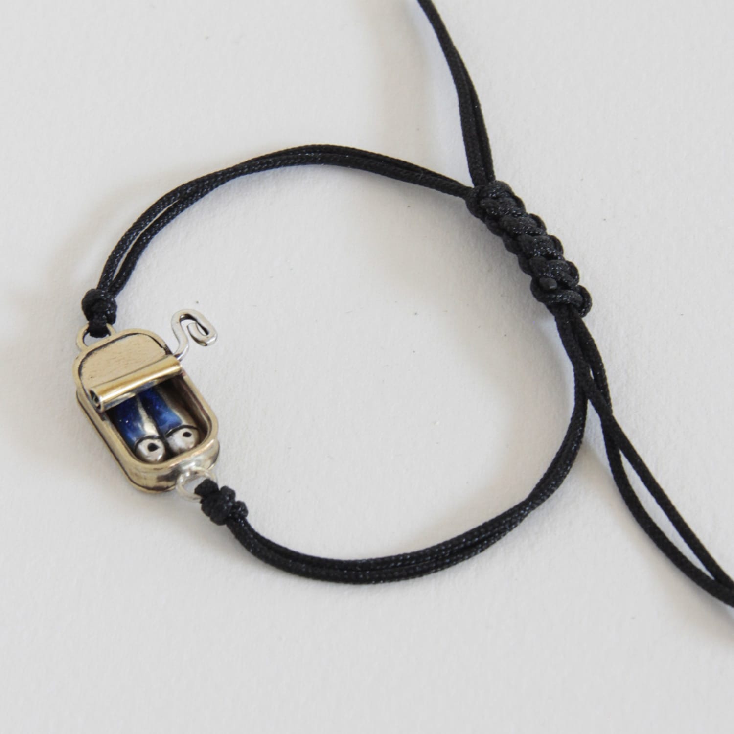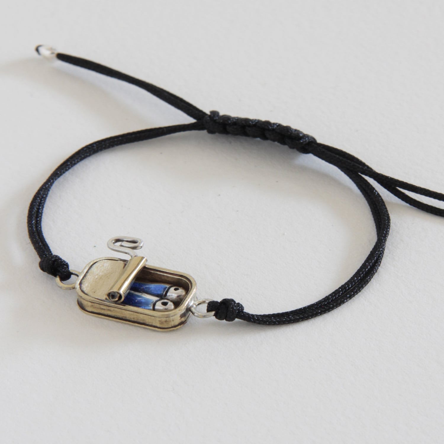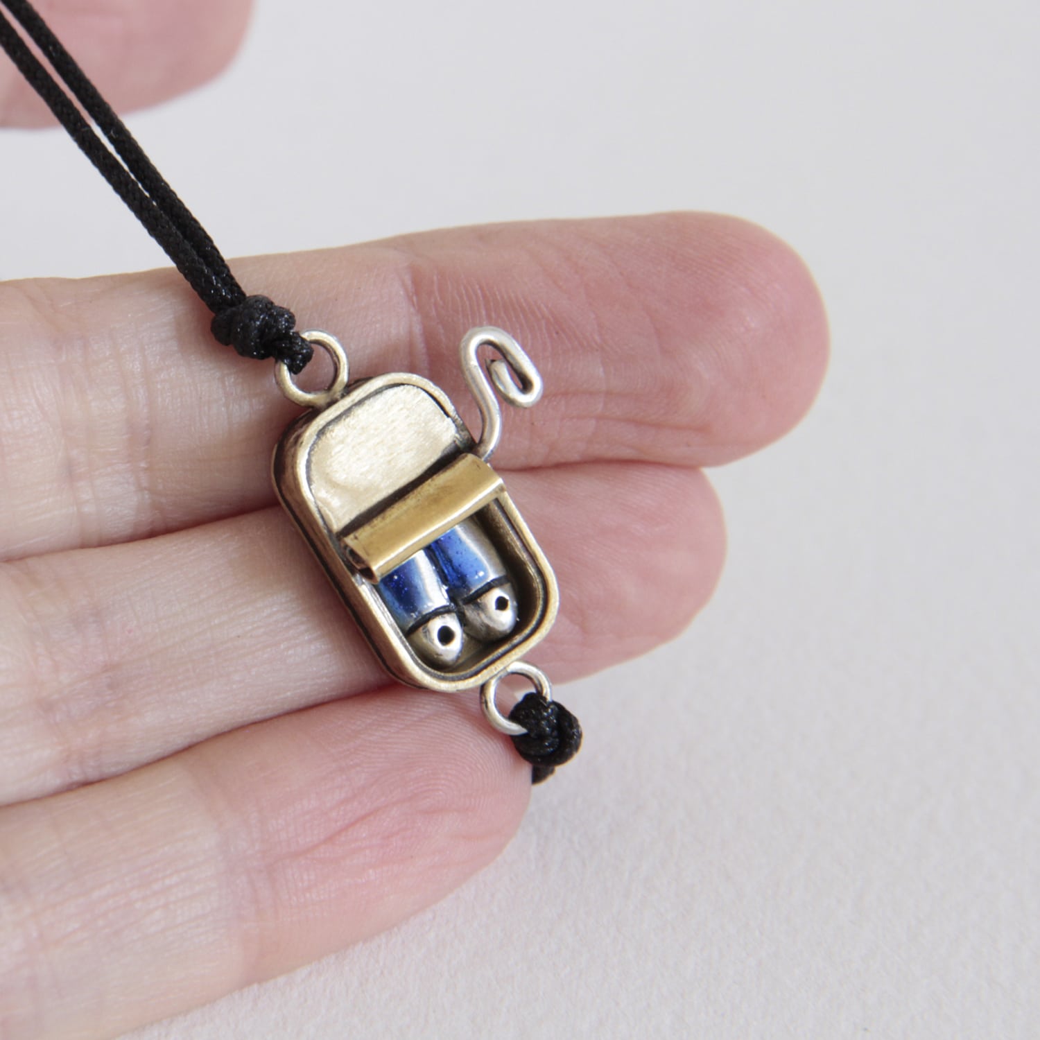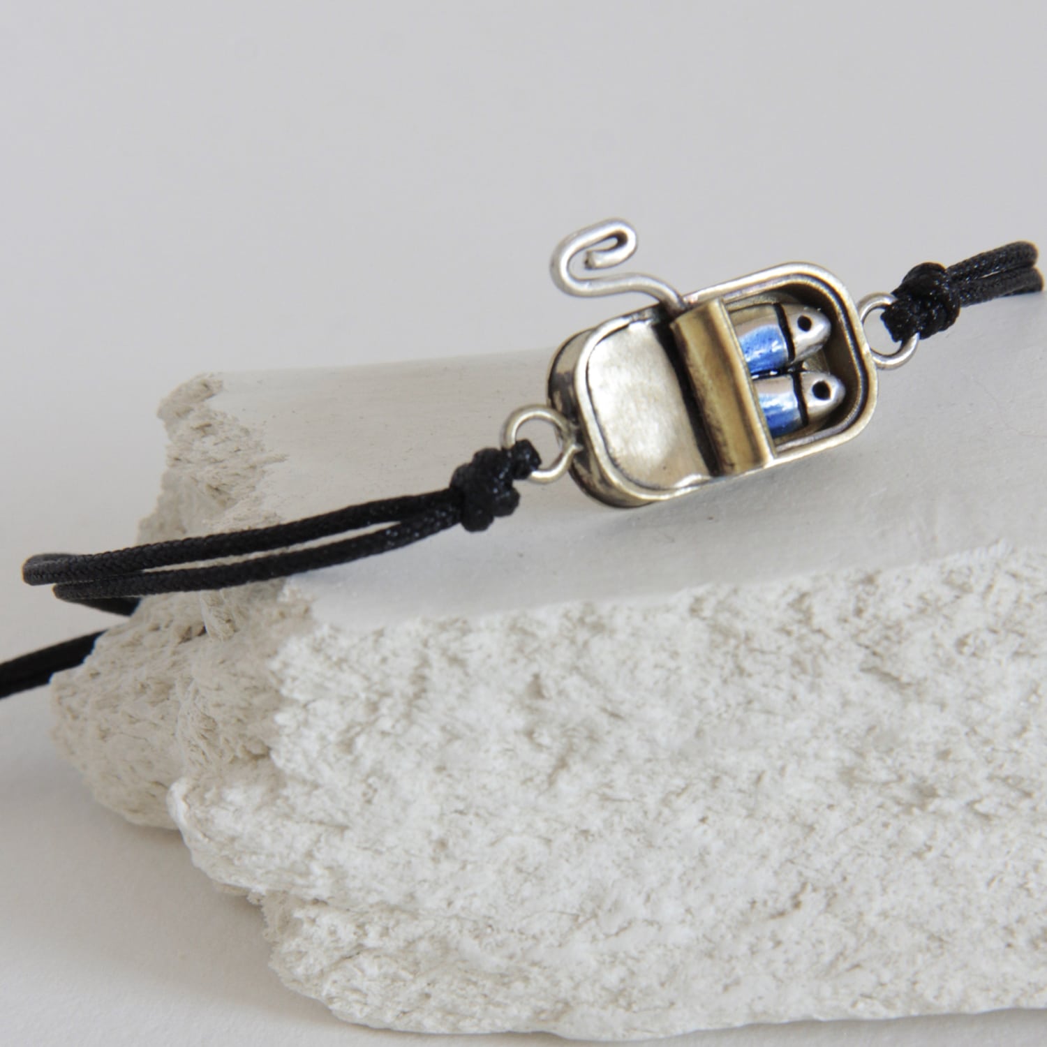 Brass and silver bracelet in the shape of a can with a pair of sardines. The sardines are enameled in blue.