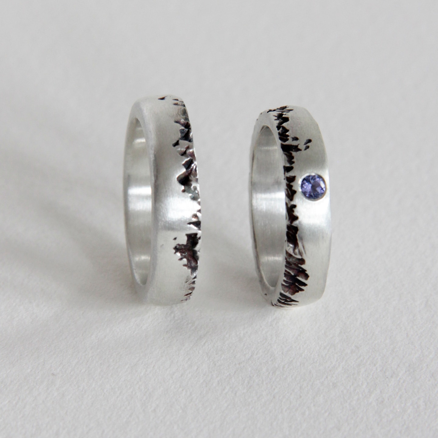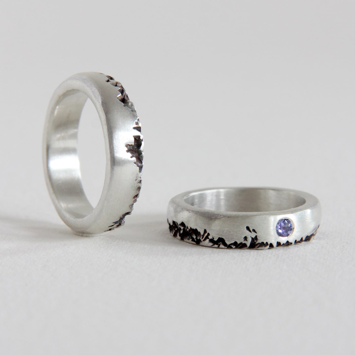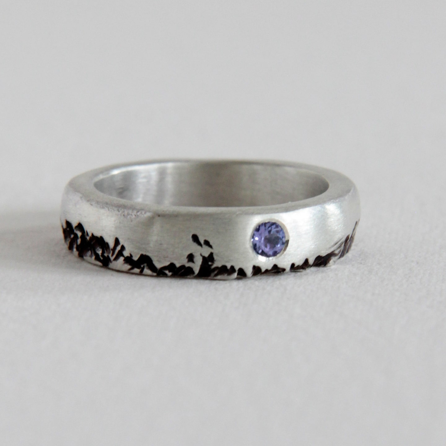 A silver band with a tanzanite stone, the ring’s texture is reminiscent of the indentations on the stone.