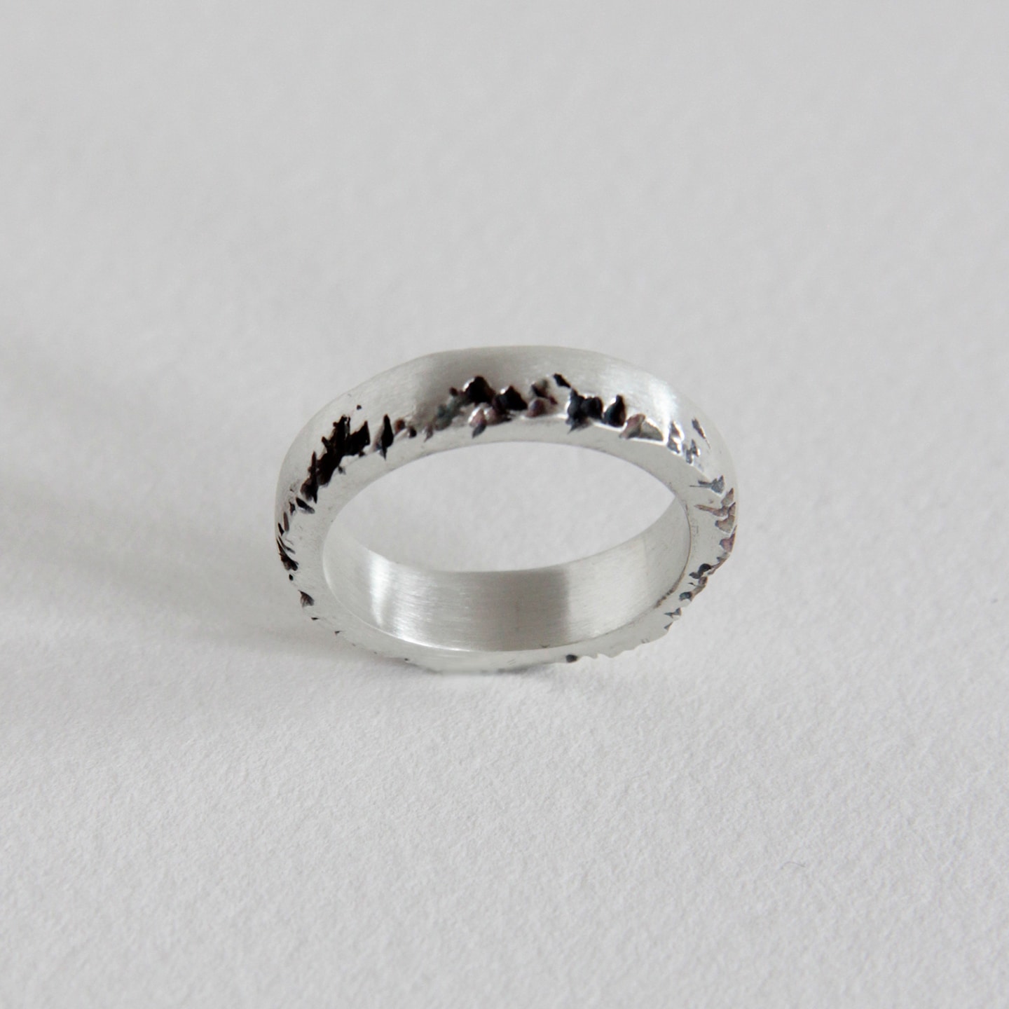 The silver has an oxidized finish in the indentations and a matte finish on the surface. The ring is 5mm wide.
