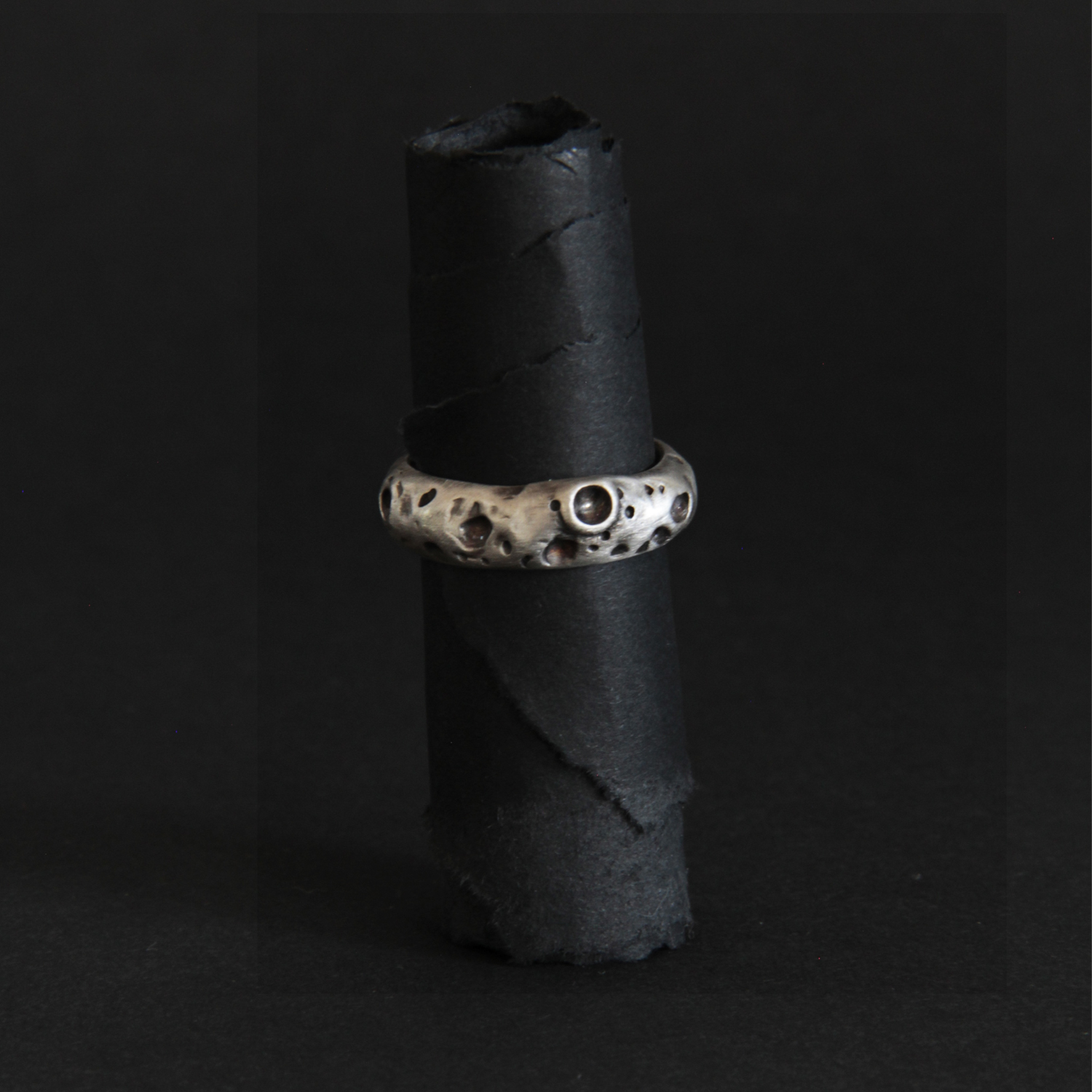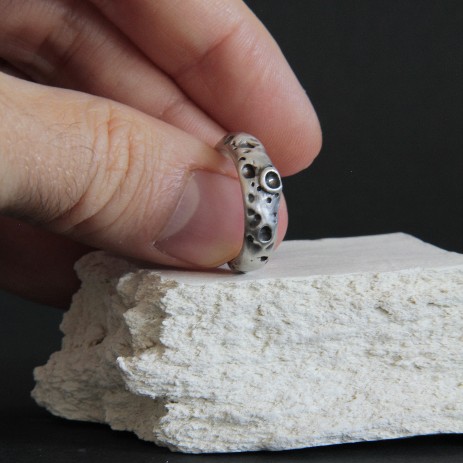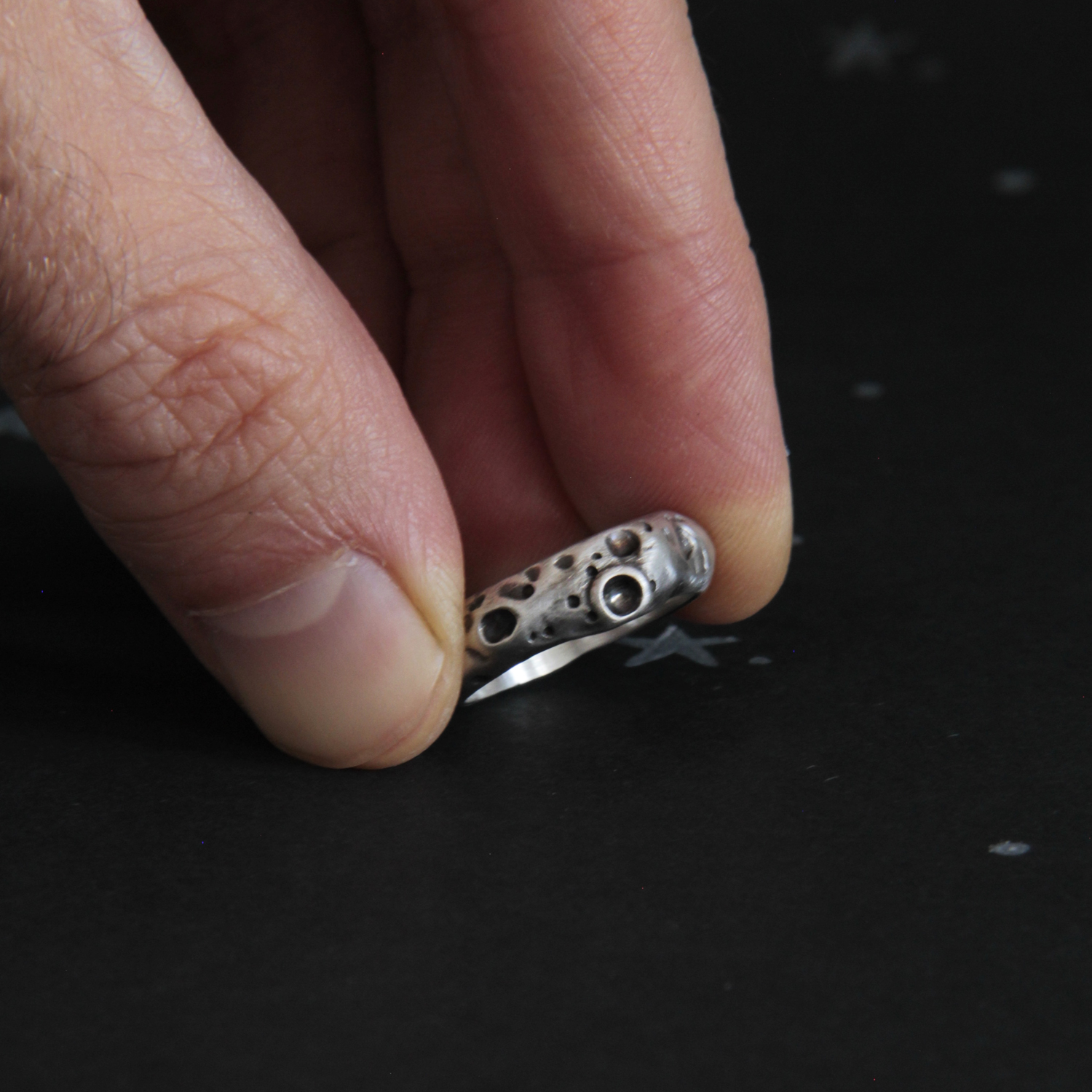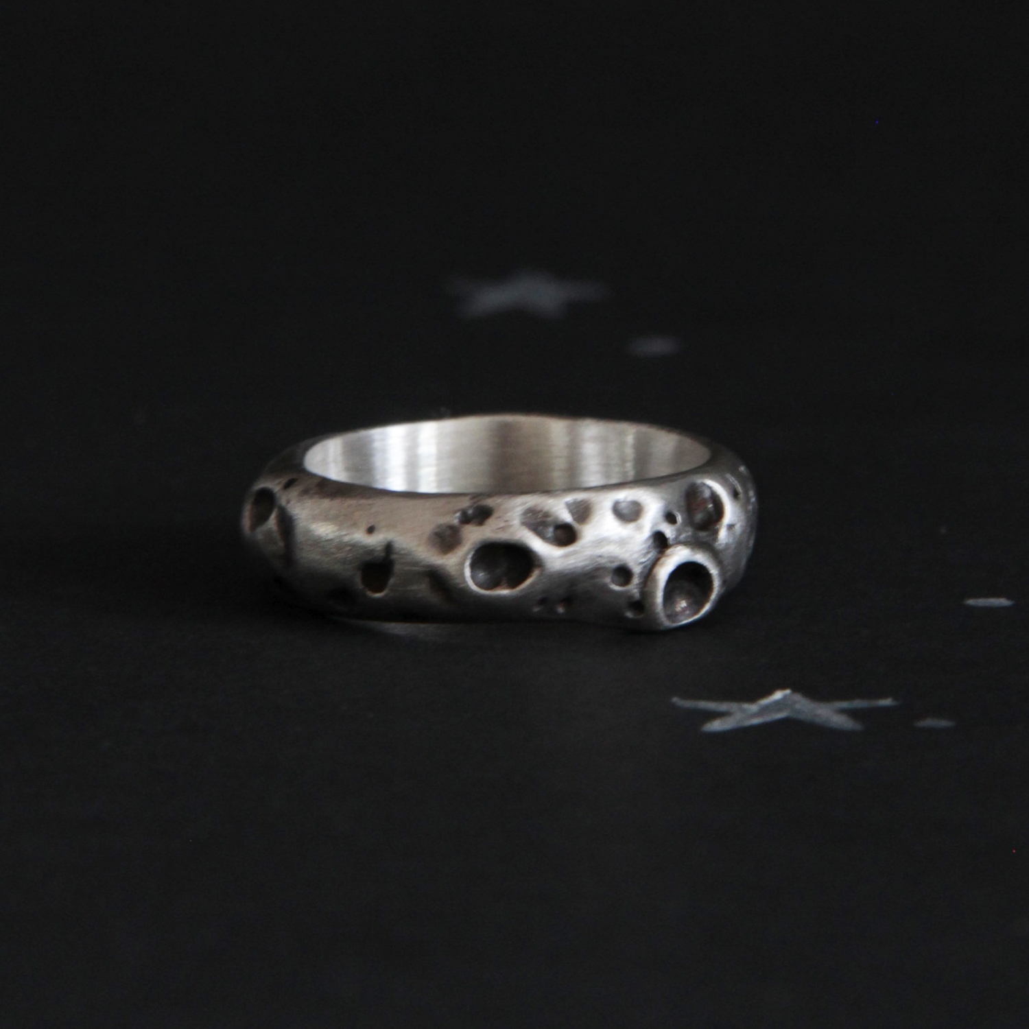 A silver ring inspired by nature. Its rustic texture evokes the moon with its craters. This ring is perfect if you dream of traveling to the moon with your partner.
