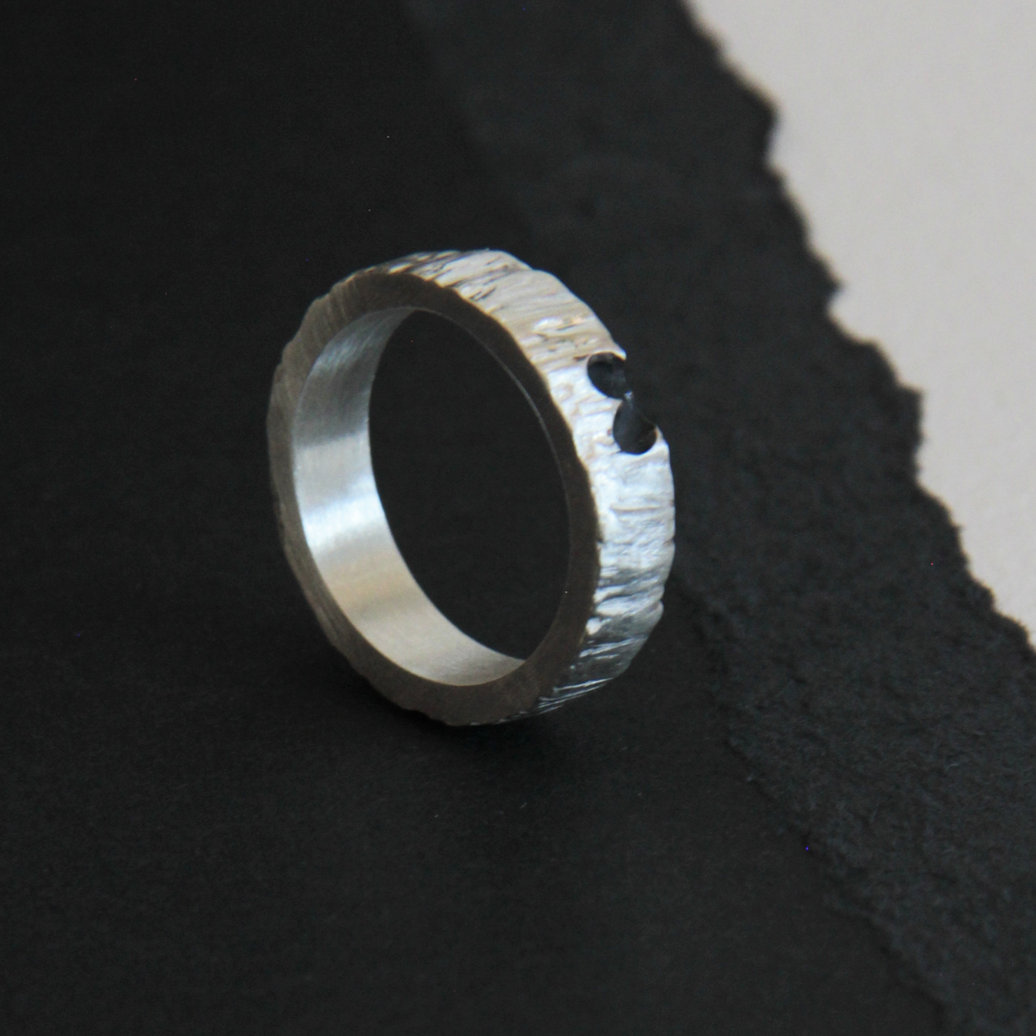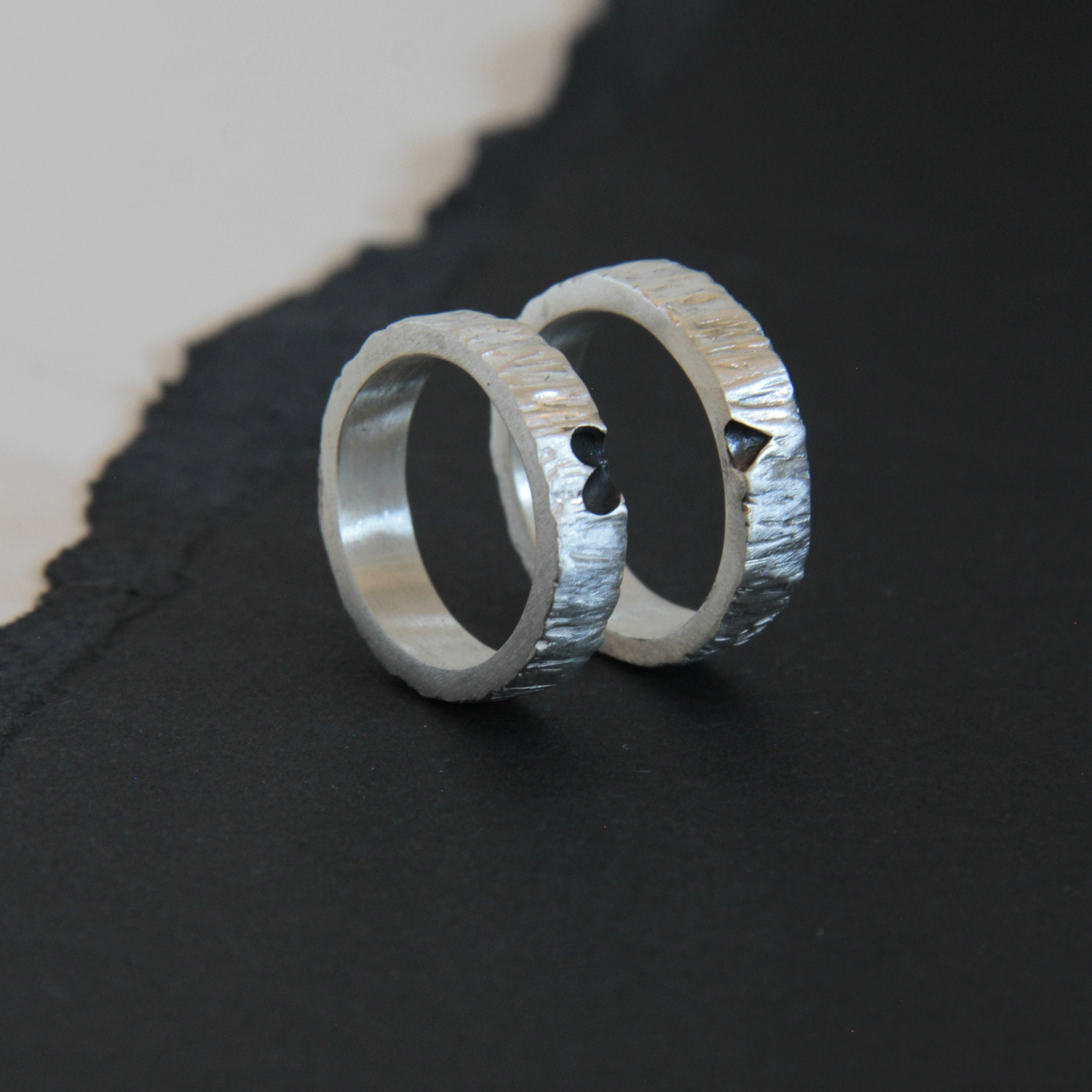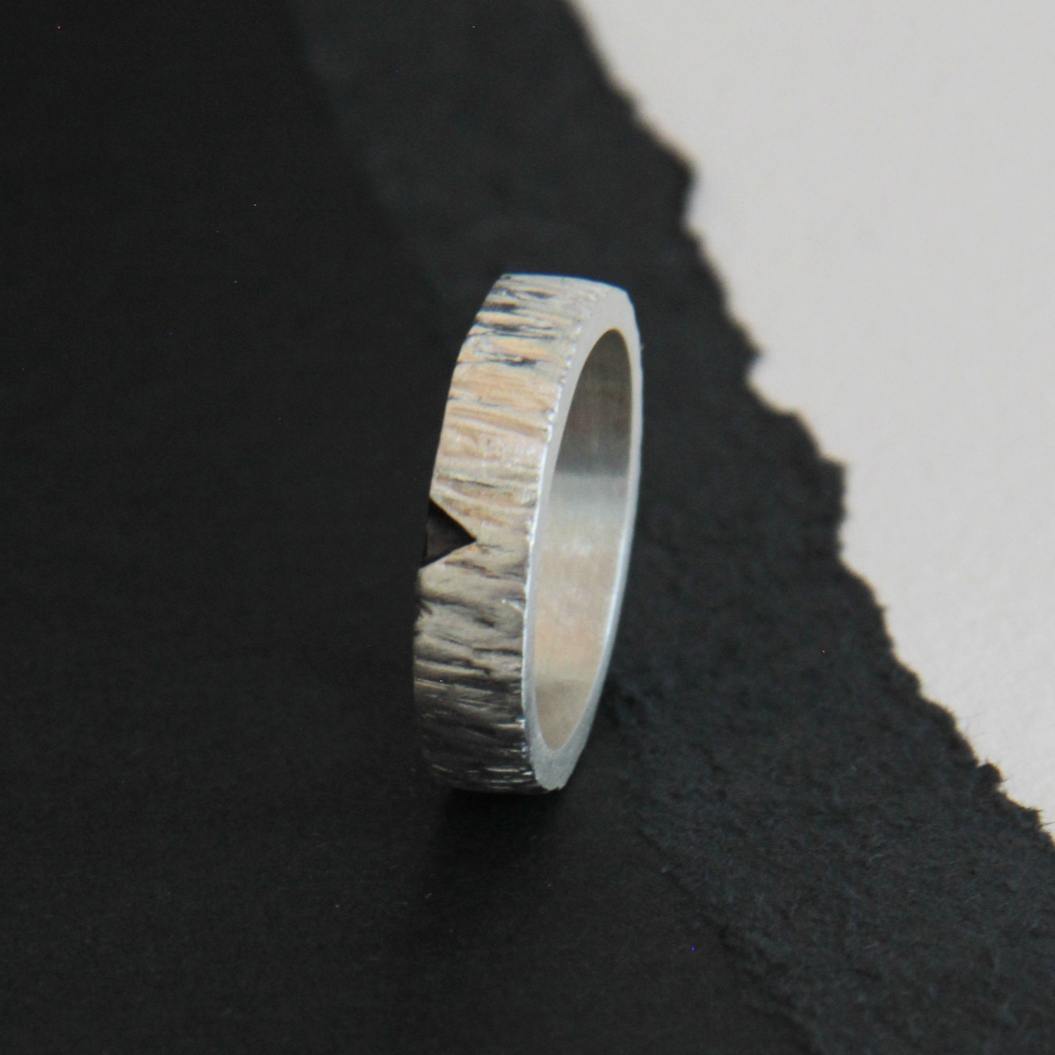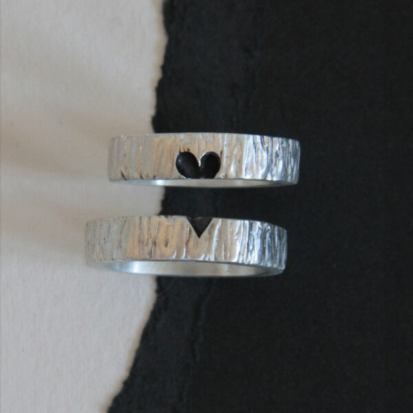 Alianza de plata con textura que recuerda a una corteza de un árbol y comparte la mitad de un corazón.