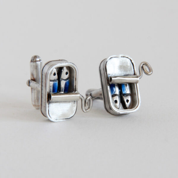 Gemelos de plata para hombre. El diseño con forma de lata de sardinas y esmalte azul es ideal para regalar.